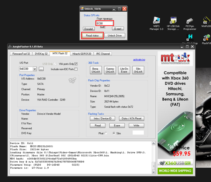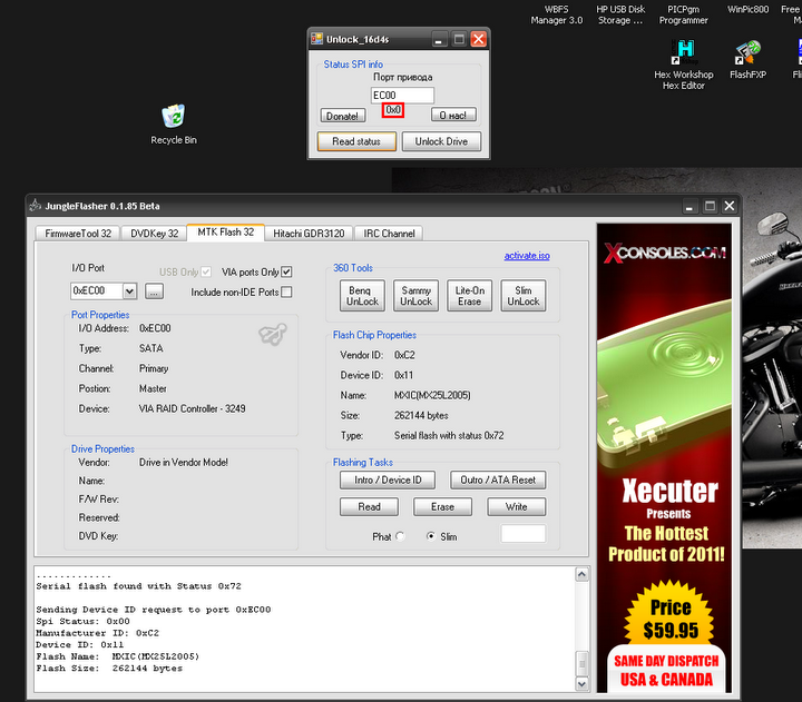 Ezután állítsuk vendor módba a meghajtót. JungleFlasher-ben Intro/Device ID!!! Majd olvastassuk ki a "Read Status" gomb segítségével a jelenlegi drive állapotunkat. 8C-t kell mutatni a portszám alatti részen.