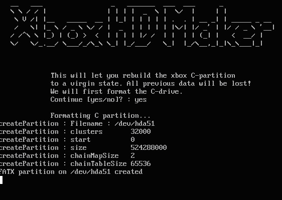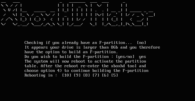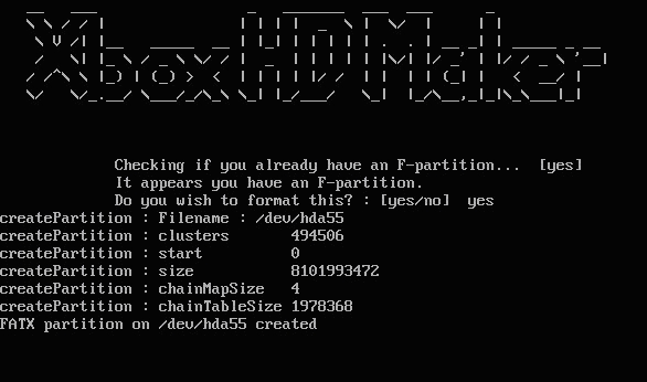 Ekkor jöhet F particó létrehozása (ha van).  Írjuk be, hogy yes és várjunk. Ha kész az F drive akkor ezt kell lássuk (ismétlem: csak 8GB-nál nagyobb vinyó esetén).
