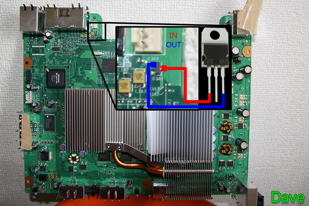 Az IC középső lábát vagy a hátsó részét (a képen át van fúrva) forraszd vagy más módon rögzítsd a gép belső keretéhez vagy valamelyik csatlakozó aljzatához. Ha a hátsó kifúrt részt rögzítjük, akkor ajánlott a középső lábat levágni. Rögzítsük úgy az IC-t, hogy az ne tudjon elmozdulni az XBOX mozgatásától, így elkerüljük, hogy a lábak összeérjenek bármilyen más alkatrésszel. Én azt ajánlom, hogy a videó kimenet aljzatának tetejére rögzítsük, úgy, hogy az IC lyukához tesszük a forrasztót és az ónt, majd hagyjuk szétterülni, így azt hozzáforrasztottuk a csatlakozó házához. Ezek után ajánlatos körberagasztani egy pici pillanatragasztóval, biztos ami biztos.