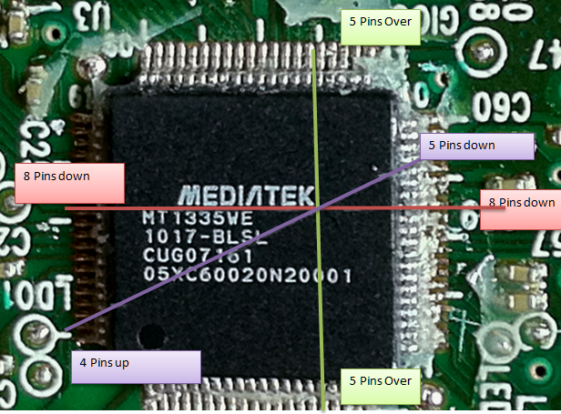 A chip-en a mellékelt ábra (lentebb) szerinti kalibráló vonalakat bekarcoljuk karctűvel, vagy szikével (nekem már megy anélkül is) hogy pontosan tudjuk a beavatkozás helyét (koordinátáját) és irányát. Az irányt a harmadik (ferde) karcolás adja, abban az irányban helyezkednek el a chip belsejében a vezetékek.