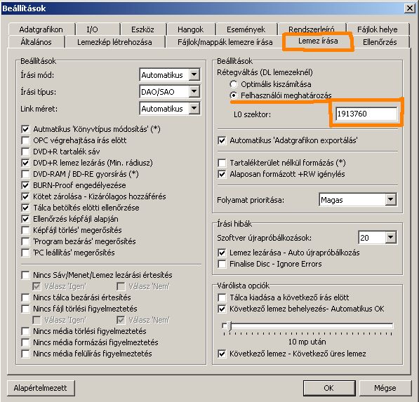 A felugró ablakban válaszd a LEMEZ ÍRÁSA fület, és ott a naranccsal jelölt részeket a képen látható módon töltsd ki az adatokkal, azaz, LAYERBREAK = 1913760: