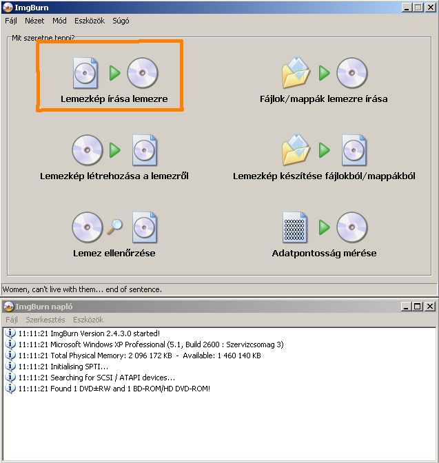 Térjünk vissza az IMGBURN programhoz, kattintsunk a LEMEZKÉP ÍRÁSA LEMEZRE gombra: